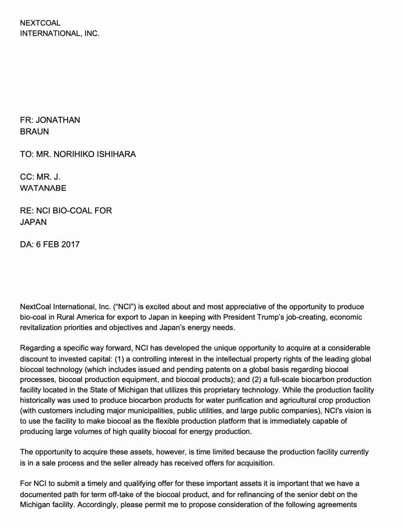 NextCoal International, Inc. (“NCI”) is excited about and most appreciative of the opportunity to produce bio-coal in Rural America for export to Japan in keeping with President Trump’s job-creating, economic revitalization priorities and objectives and Japan’s energy needs.