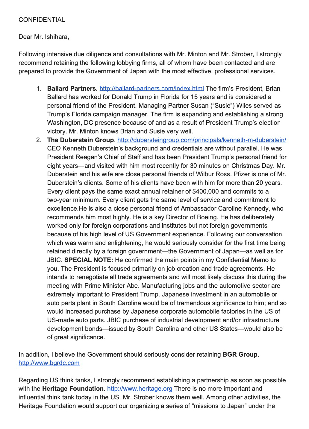 Following intensive due diligence and consultations with Mr. Minton and Mr. Strober, I strongly recommend retaining the following lobbying firms, all of whom have been contacted and are prepared to provide the Government of Japan with the most effective, professional services.