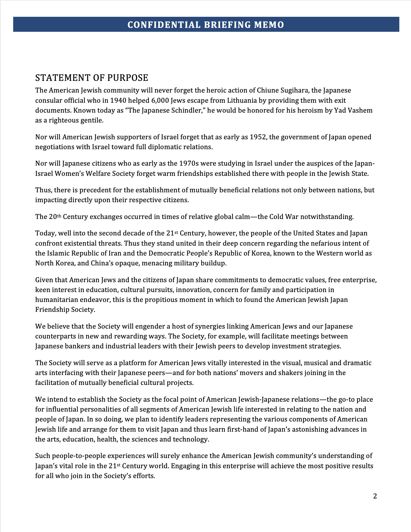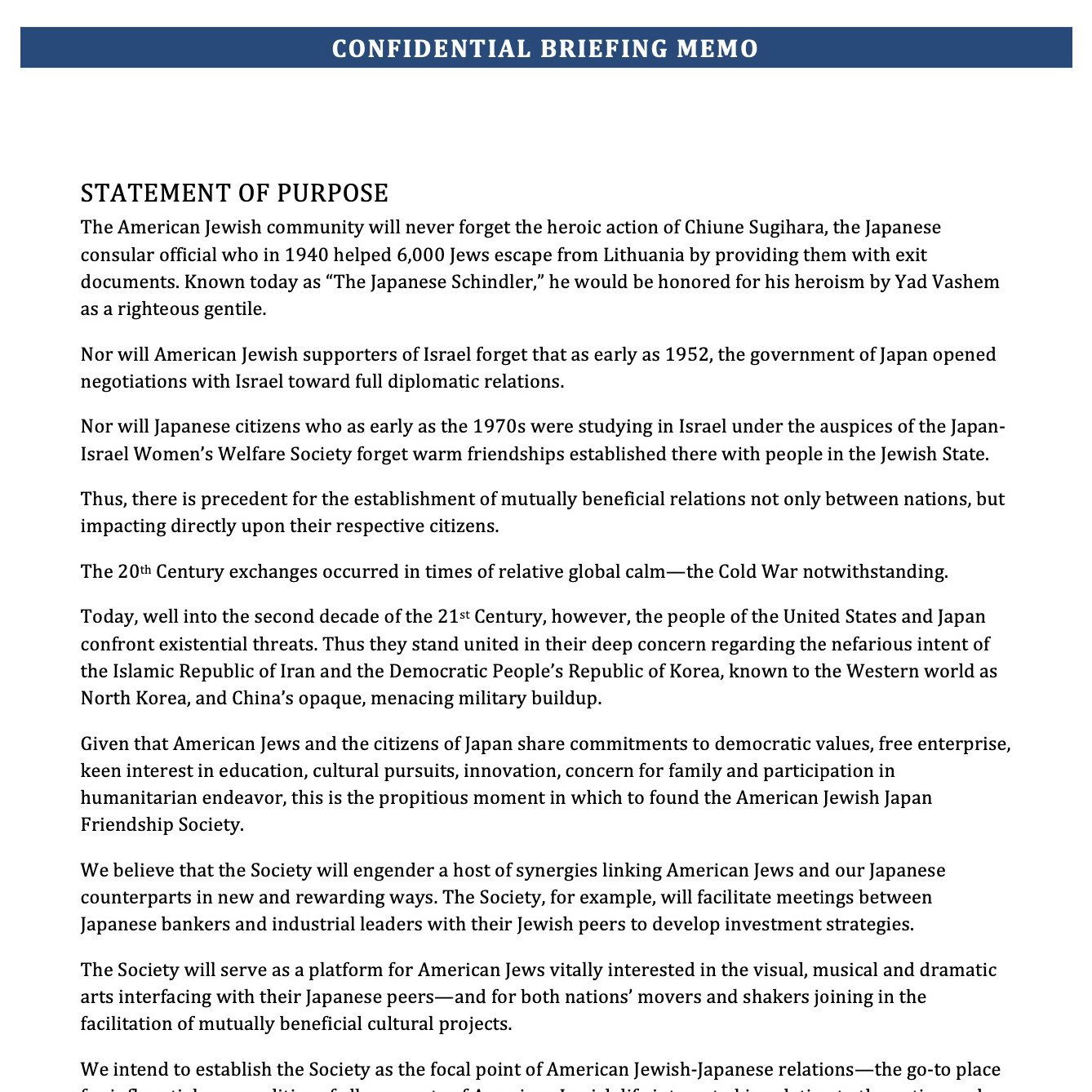 基本理念 日米両国の国益と日米間の更なる2国間関係に寄与する為に組織されたユニークな非営 利団体である在米ユダヤ人・日本人友好協会は、2017年5月、総裁ゲラルド・ストロー バー氏、デボラ・ストローバー夫人及び会長のジョナサンブラウン氏と、日本国際協力 銀行代表取締役副総裁、内閣官房参与 前田 匡史氏とで、2017年5月ニューヨーク市に 於いて会合し設立の次の協会理念に至った。